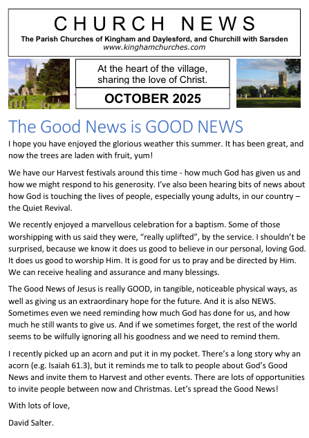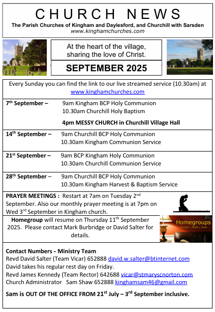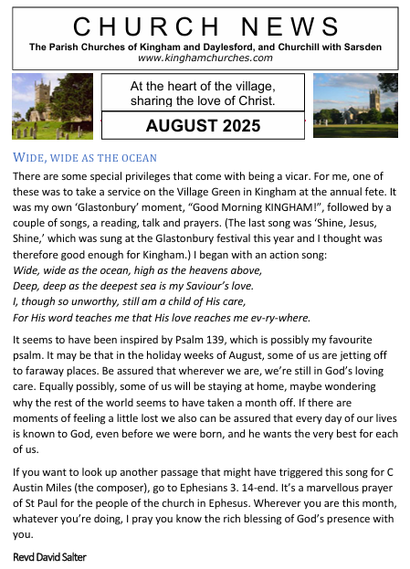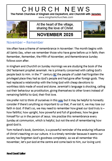 We publish Church News each month, through Roundabout for those living in Churchill and Sarsden, and in the Kingham Newsletter, which is on sale at Kingham Village Stores. You can also click the image on the right to open it in PDF format.